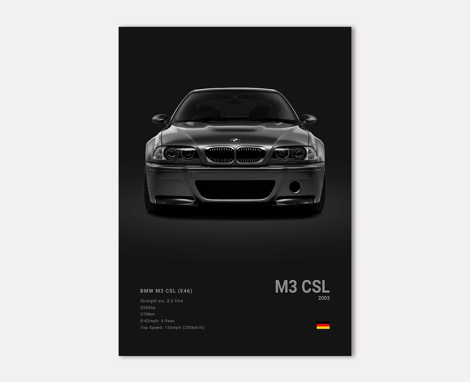 A striking art print featuring the iconic front view of the 2003 BMW M3 CSL (E46). Set against a dark, minimalist background, the image highlights the car’s aggressive stance and signature BMW design. Key specifications are displayed at the bottom: straight-six 3.2-litre engine, 355 bhp, 370 Nm of torque, 0-62 mph in 4.9 seconds, and a top speed of 155 mph (250 km/h). The German flag in the corner celebrates the car’s heritage—perfect for automotive enthusiasts and modern interiors.